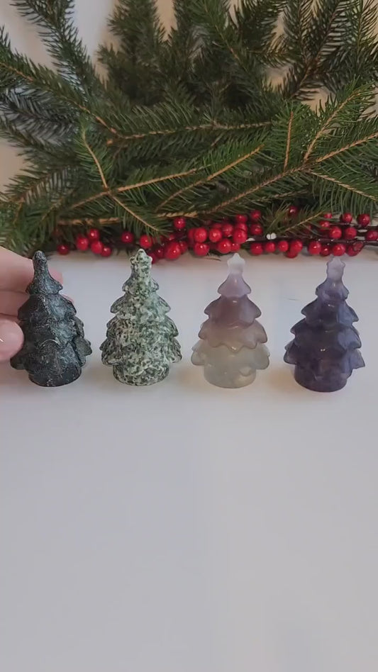 Tree Carving | Christmas Crystals | Holiday Pocket Stone | Green Spotted, Kambaba, Fluorite | Choose Your Material