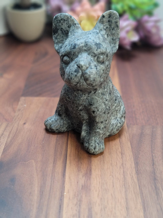 Larvikite French Bulldog Carving: Gray Crystal Puppy, 4 inch
