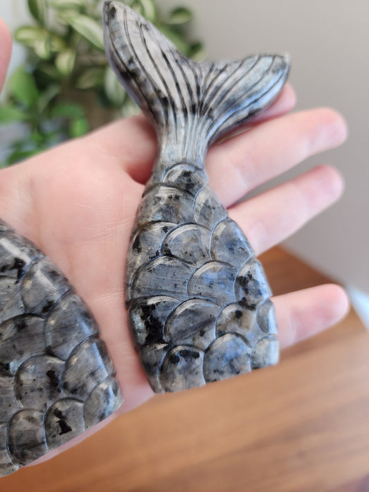 Larvikite Crystal Mermaid Tail: Gray, Silver, and Blue Decor