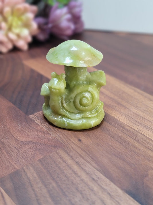 Magnificent Mushroom and Snail Serpentine Crystal Carving | 2.4 Inches | Green and White| Intuitively Chosen
