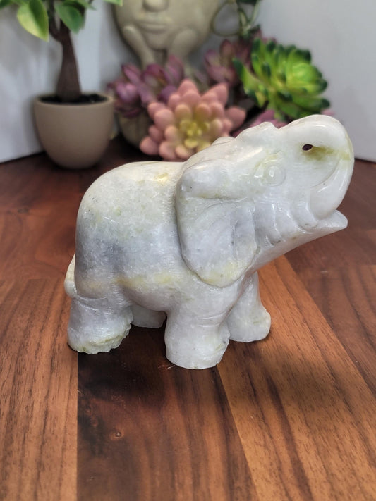 White Jade Elephant Crystal Carving | B | 4.3 X 3.9 Inches | White and Green | One of a Kind
