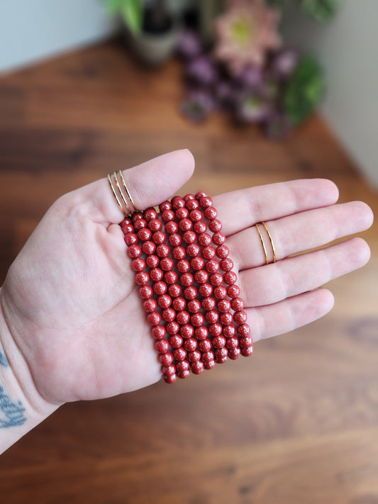Cinnabar Crystal Bracelet | 6MM | Gorgeous Rosey Red Shimmer | Polished Crimson Beads on Stretchy Elastic Band | Classy Christmas Jewelry