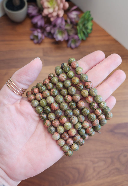 Unakite Crystal Bracelet | 8MM | Natural Green Beads with Orange and Pink | Earthly Granola Girl Jewelry for Nature Lovers | Fall & Autumn