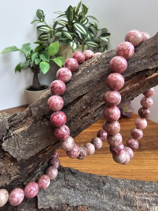 Pink Fossil Stone Bracelet: 8MM Chrysanthemum Crystal Bead Jewelry