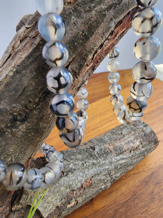 Dragon Lace Agate Bracelet: 7.5MM Translucent Blue Crystal with Black Veins and Webbing | Cloudy Gray Patterned Unique Jewelry | Goth Vibes