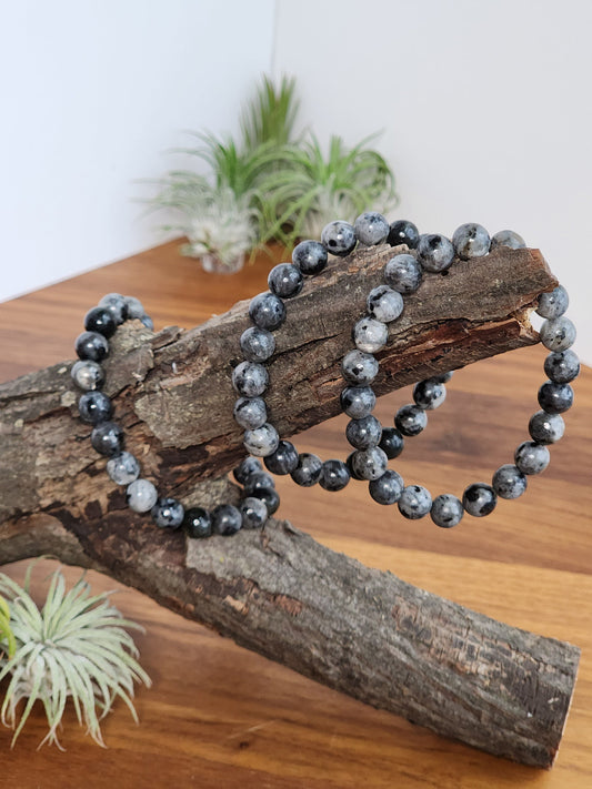 Larvikite Crystal Bracelet: 8MM Flashy Blue and Silver on Dark Gray Smooth Gemstones | Interesting and Unique Fidget Jewelry for Fathers Day