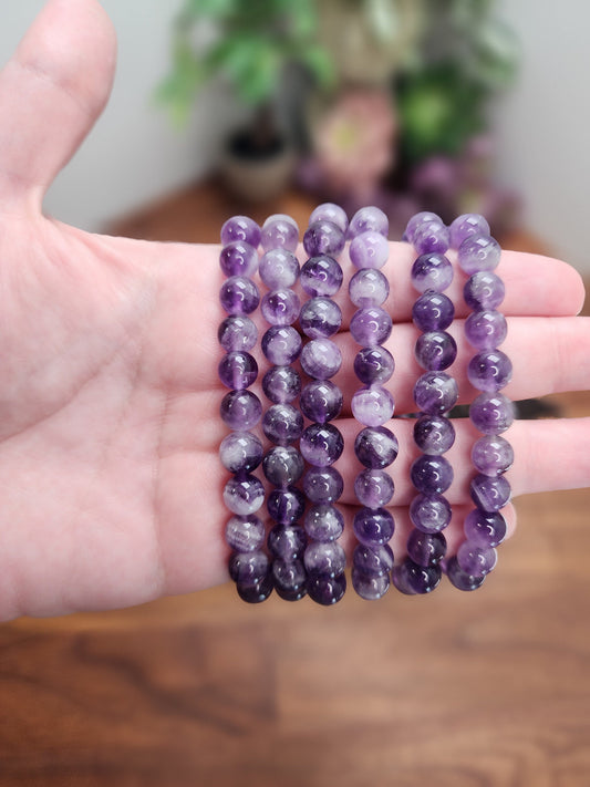 Dream Amethyst Bracelet: 8MM Natural Purple Crystal Beads, Some with Chevron Mountain | Dainty for smaller 6" wrist | Lilac Clear Quartz