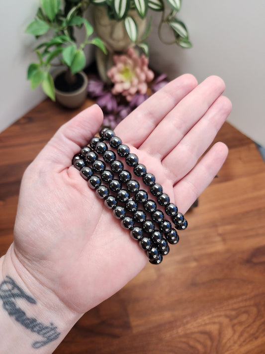Hematite Crystal Bracelet: 8MM Tera Hertz Beads | Shiny Silver Metallic Gray and Black | Grounding Stone for Iron Warrior Energy