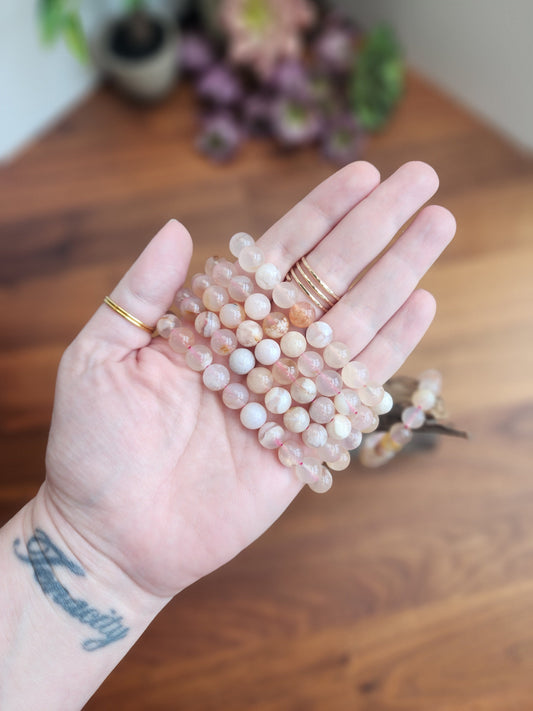 Flower Agate Bracelet: 8MM Crystal beads in peachy pink hues with Blossom Inclusions | Spring or Easter | Summer Garden Outfit Idea