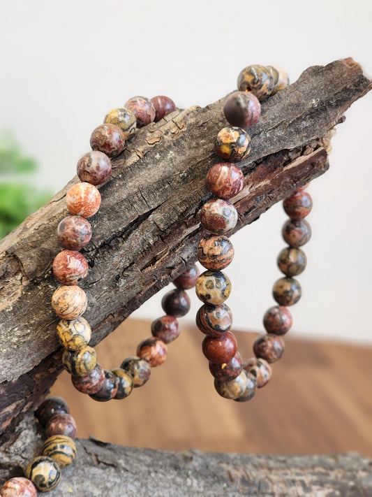 Leopardite Crystal Bracelet: 8MM Leopard Skin Jasper Beads, aka Safari Jaguar Stone | Pink Red Tan Green Patterns for Wild Girly Side Gifts