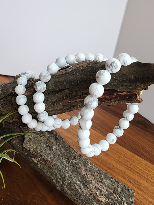 Howlite Bracelet: 8MM Beaded Crystal Jewely | White & Gray Marbled Stretch Natural Gemstone Gift | Nuetral for Matching Friend or Couples