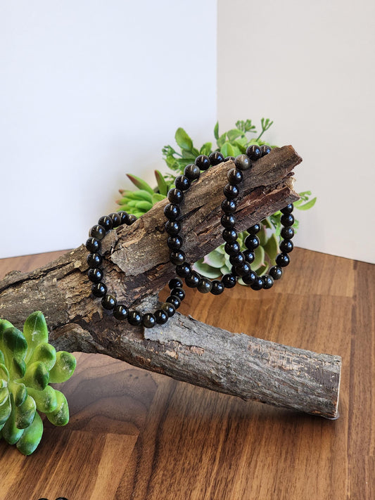 Gold Sheen Obsidian Bracelet: 8MM Natural Black Crystal Beads with Golden Chatoyant Effect