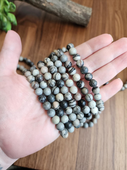 Gray Picasso Jasper Crystal Bracelet, Marbled Beads (8mm Stretch)