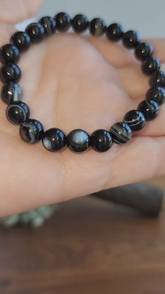Black Banded Agate Bracelet: 8MM Sardonyx Crystal Beads | White & Coffee Brown Striped Patterns | Beautiful Swirl Patterns | Unique Gift