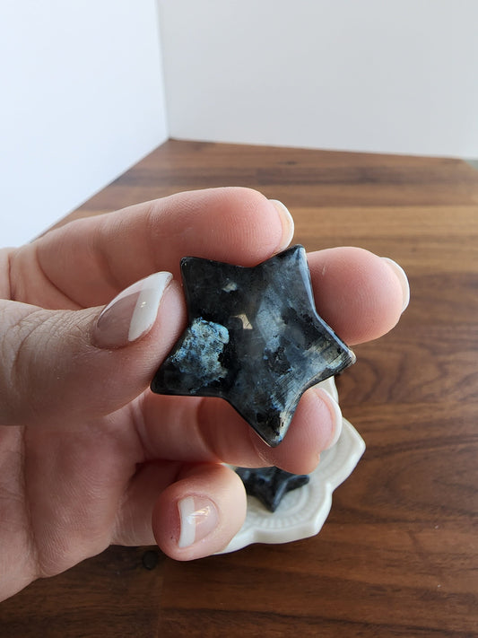 Larvikite Star | Mini Crystal Carvings | Small Black, Gray, and Silver Sheen Stars | Flashy Blue Crystals | 5 Dollars | Intuitively Chosen