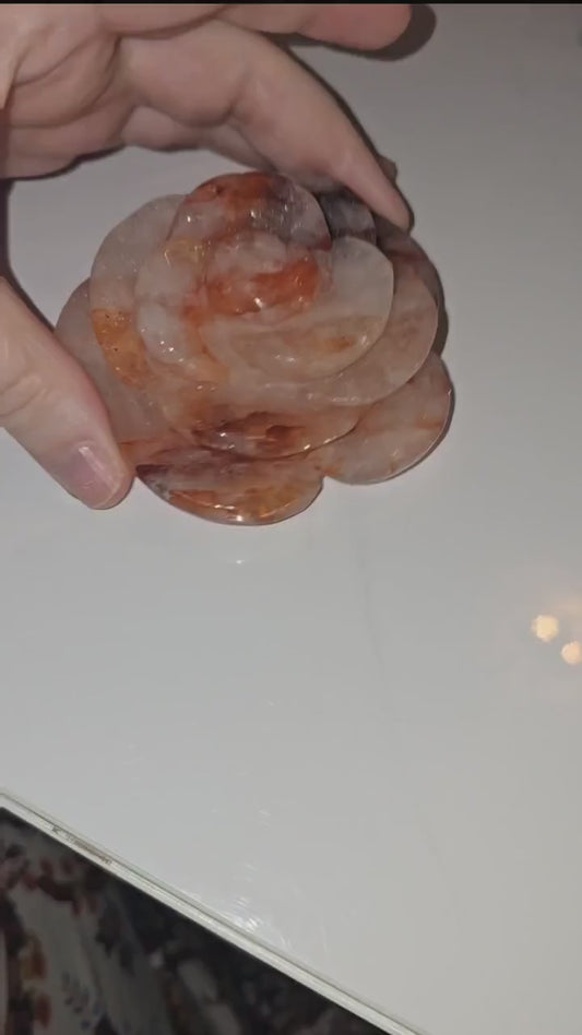 Fire Quartz Rose Crystal: Red Hematoid Inclusions, Rainbow Sheen | Carved Gemstone, Unique Home Accent | 3 inch