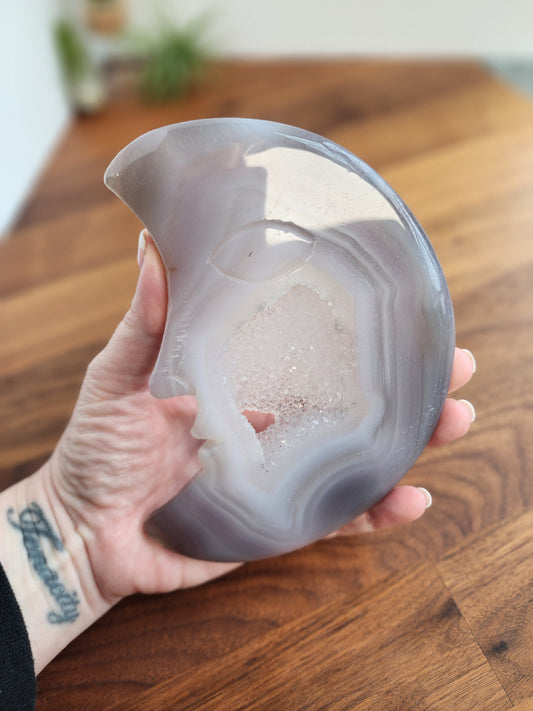 Druzy Agate Crescent Moon: Sparkly Crystal Geode with Stand