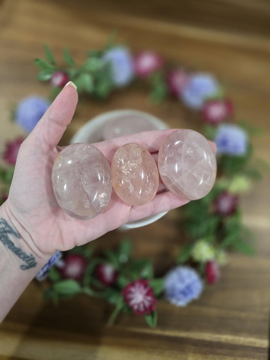 Rainbow Rose Quartz Palmstone: Hand Carved Pink Crystal Fidget