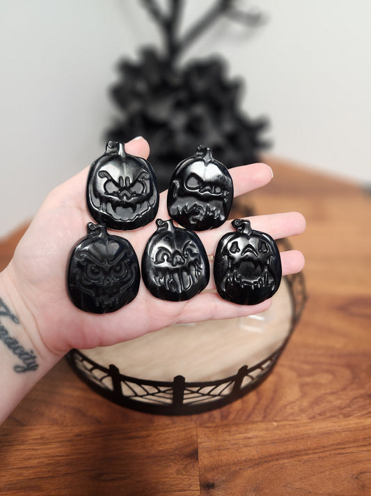 Scary Pumpkin Face Crystals | Black Obsidian Flat Stones with Spooky Season Emoji Expressions | Jack-O’Lantern Goth Gifts for Boo Baskets
