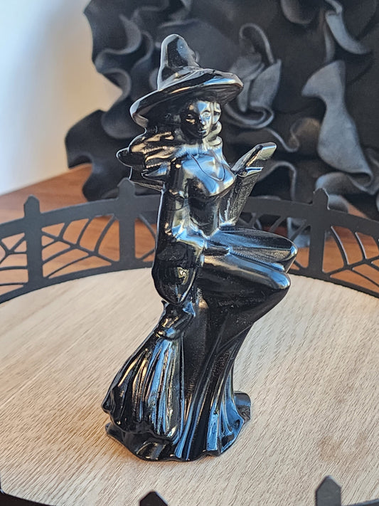 Obsidian Witch | 4.5" Tall Crystal | Black Crystals | Witchy Vibes | Detailed High Quality | Halloween | Witch Hat on Broom | 3D | Only ONE