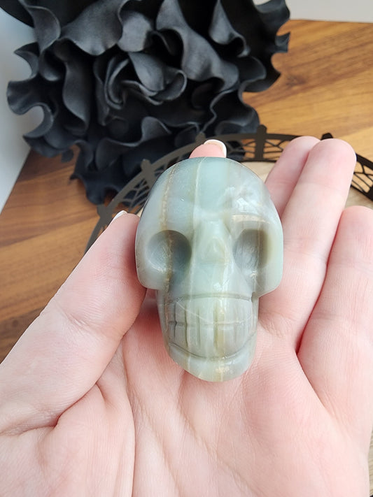 Caribbean Calcite Skull: Blue Green Crystal Head, Halloween Decor (2")
