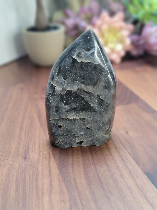 Druzy Sphalerite Flame: Black and Gray Crystal Carving (3.5")