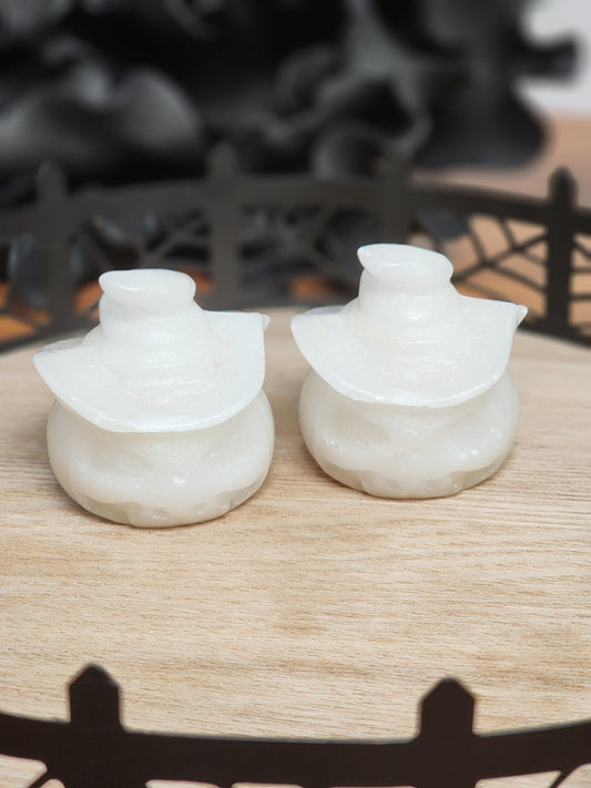 White Jade Crystal Pumpkin with Witch Hat | 3D Hand-Carved Halloween Decor for Spooky Season | Unique Boo Basket Treat or Gift for Autumn
