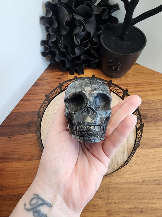 Larvikite Crystal Skull: 3" Silver Flash Spooky Decor