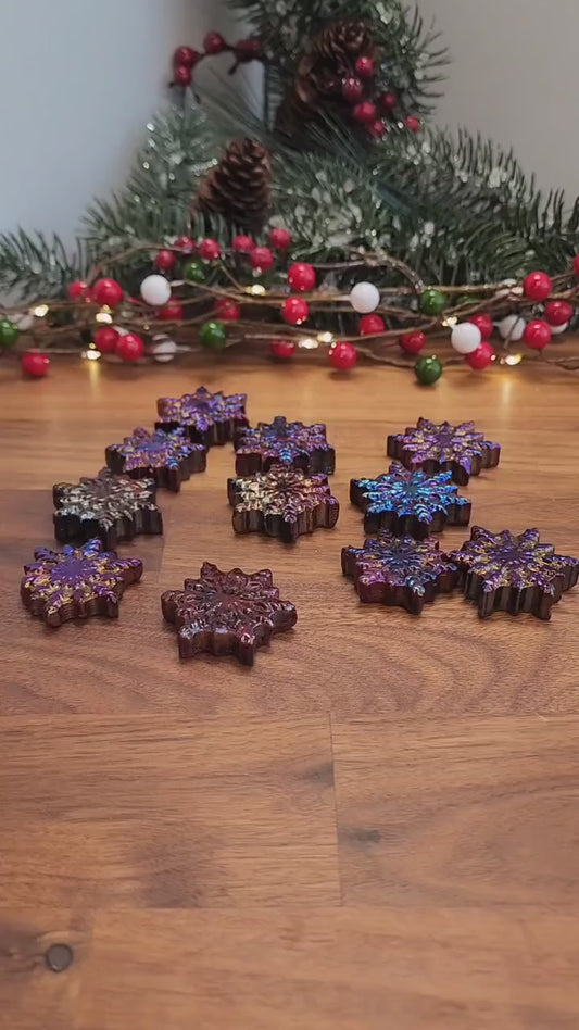 Aura Coated Mahogany Jasper Snowflake Carving: Rainbow Christmas Decor