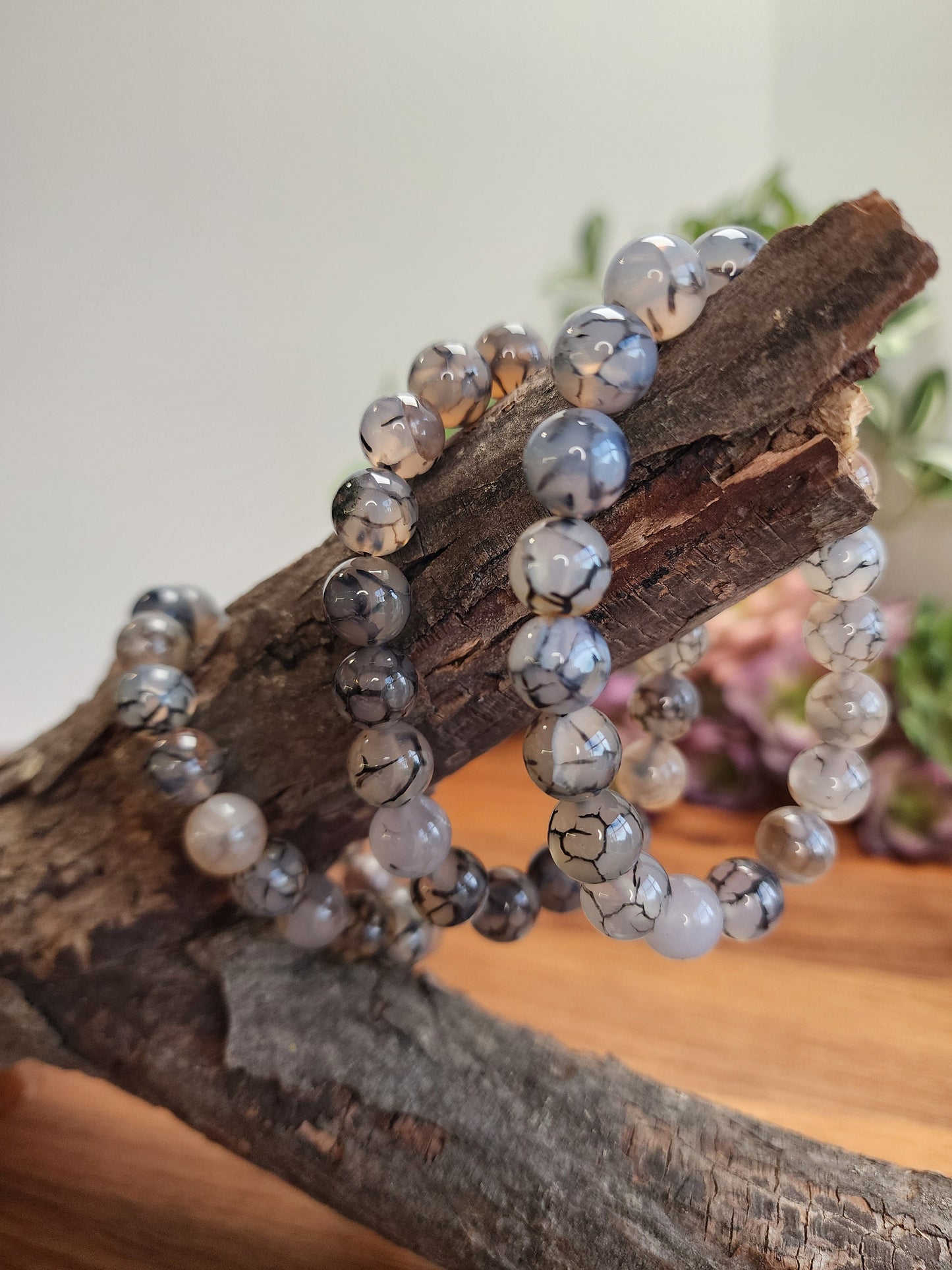 10mm larger size Dragon Vein crystal bead jewerly. Stunning black patterns over clear quartz make these a favorite around the Halloween, Goth Decor, and Spooky Season lovers.