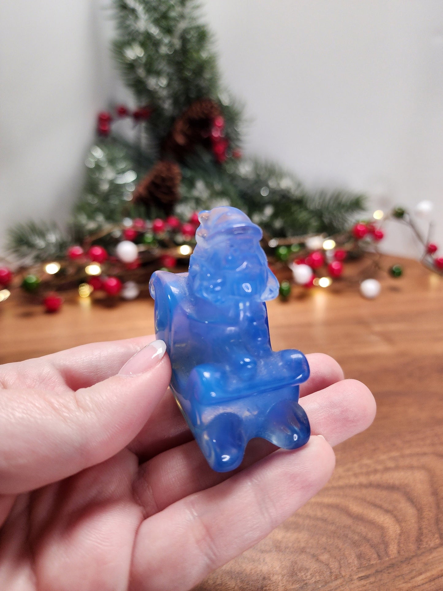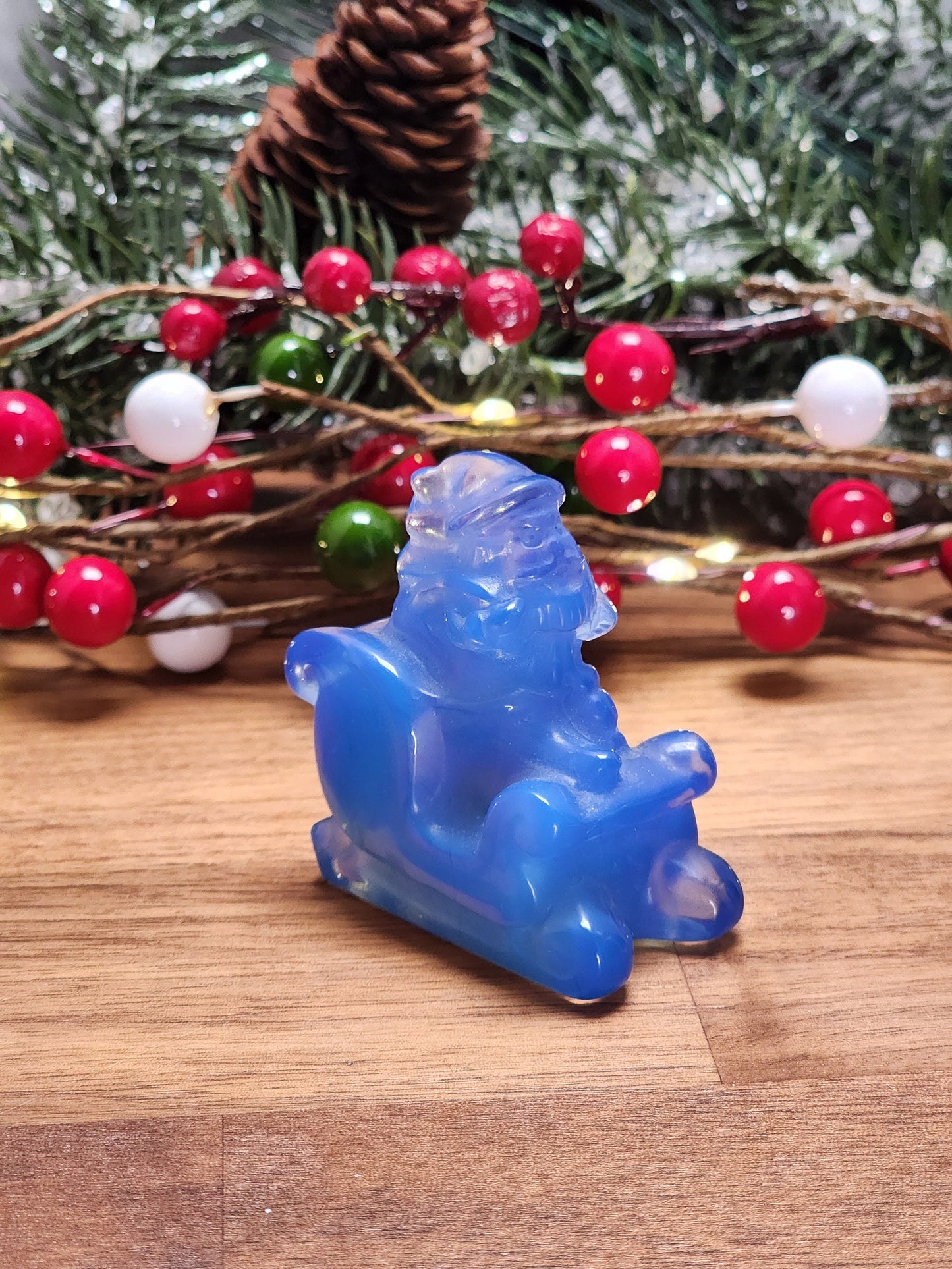 Adorable Blue Opalite Santa on his sleigh ready to deliver toys and presents around the world. This carving shows a jolly old elf relaxing in his sleigh with his foot on the dash. Only one available.